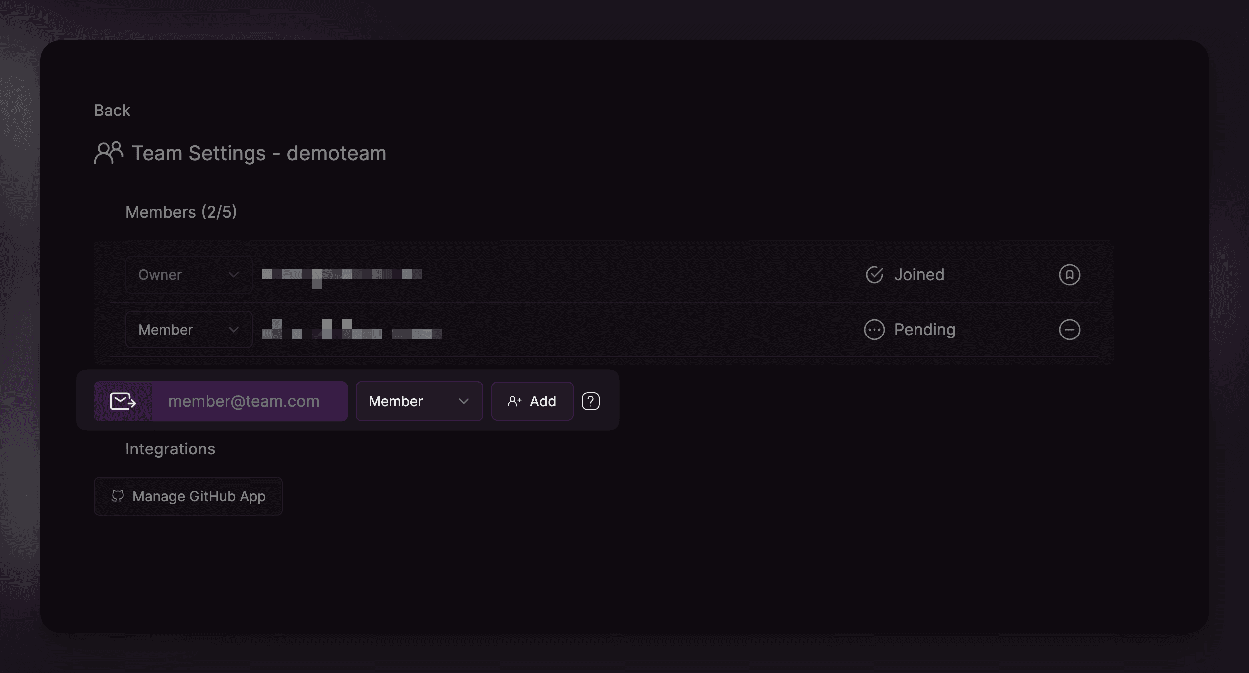 In the team settings page, add the email address of the person you want to invite and click on the "Add" button.